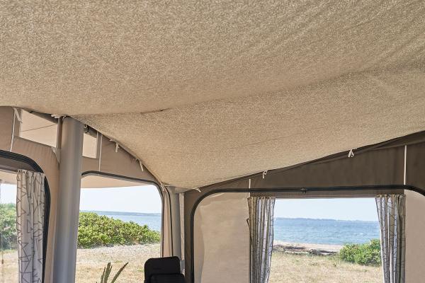 C'est une bonne idée d'installer un vélum intérieur, surtout si vous campez au début du printemps ou à la fin de l'automne. Le toit intérieur permet de recueillir la condensation qui peut dégouliner du toit. Ce vélum est spécialement conçu pour être installé dans le Ventura Air Dove 400.