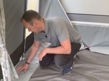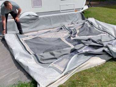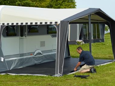Les auvents sont souvent plus larges près de la caravane qu'à l'avant. C'est pourquoi il est conseillé de calculer la superficie au sol avant d'acheter un tapis de sol ou un autre revêtement.