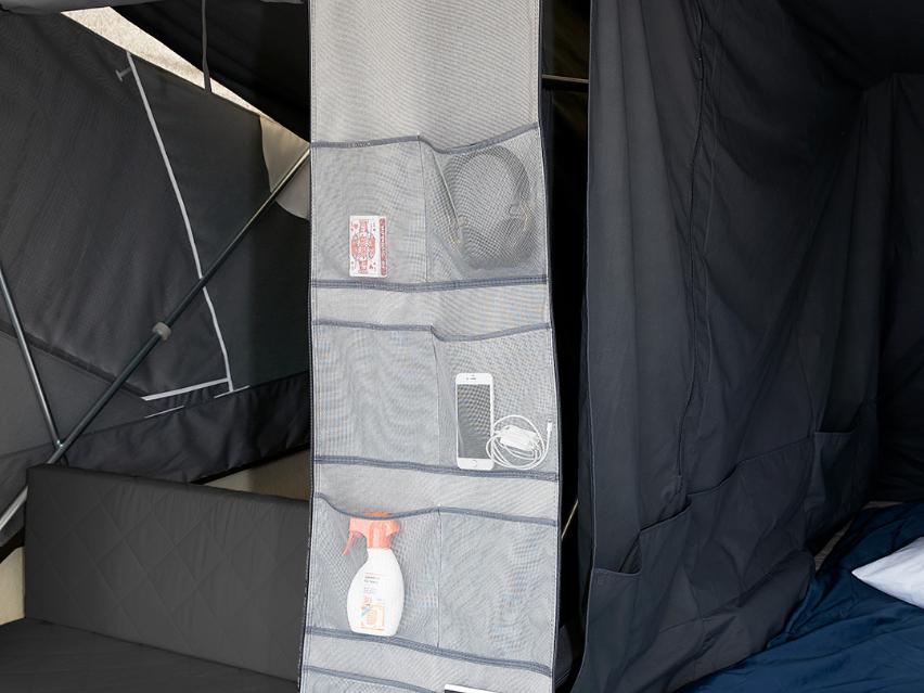 Le Camp-let Passion regorge d'options de rangement pratiques qui vous permettent de ranger plus facilement les petits et les grands objets. Une housse de rangement avec des poches est montée devant les cabines de couchage pour tous vos petits objets.