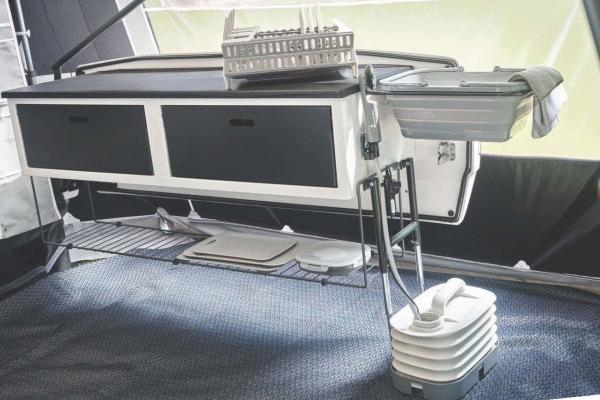 Under the worktop you will find two spacious storage compartments and a shelf that are perfect for keeping your crockery and cookware organised and easily accessible. The kitchen also includes a 10L foldable water tank and a foldable washing-up bowl, both of which take up minimal space during transport and storage. Electric water pump with tap and shower head, that charges via USB, ensure you have water for washing up and showering.