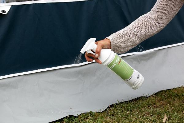 - Entfernt Imprägnierung – das Vorzelt muss nach der Anwendung mit AquaTex Spray neu imprägniert werden