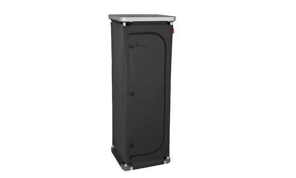 Garderobeskabet er foldbart og nemt at skille ad og samle igen, når en ny feriesæson banker på døren. Det er fremstillet i slidstærkt aluminium og plast, der holder til det meste.