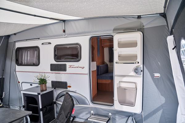 Eriba Touring -etuteltan avulla saat matkailuvaunuusi suuren oleskelutilan, joka on suunniteltu toiminnallisuutta ja yksityiskohtia ajatellen. Teltta on suunniteltu siten, että asuntovaunun ovi voi avautua kokonaan. Integroitu kattotyyny varmistaa, että teltta asettuu tiiviisti matkailuvaunua vasten ja johtaa siten veden pois.