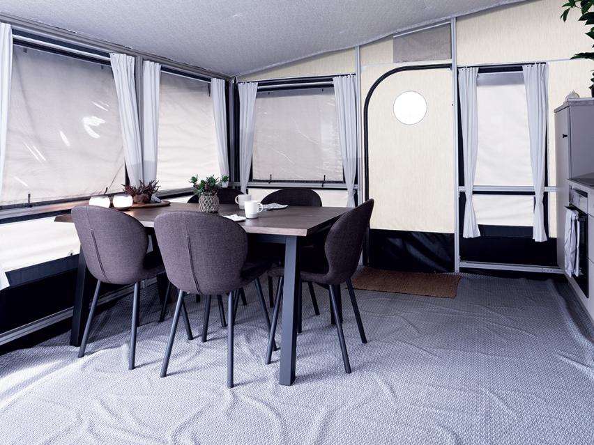 Isabella VILLA est conçu pour le camping tout au long de l'année et met l'accent sur la stabilité et le confort. Avec un plancher robuste, vous obtenez une base sèche et fiable qui peut être améliorée avec un comfort carpet, un tapis ou un chauffage au sol pour une isolation supplémentaire et une chaleur luxueuse - parfaite pour les jours froids.
