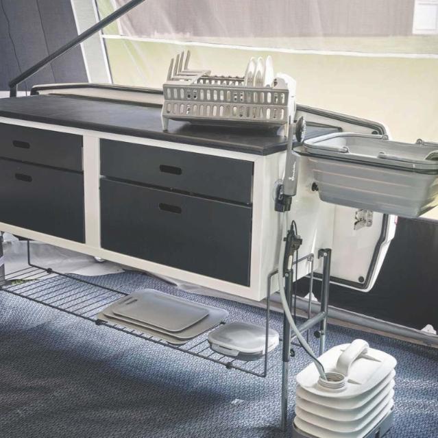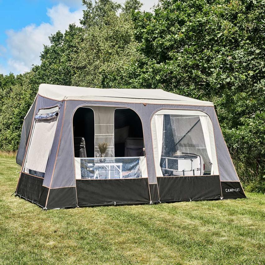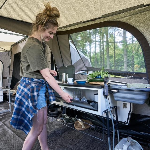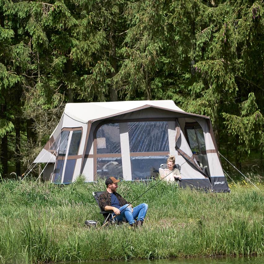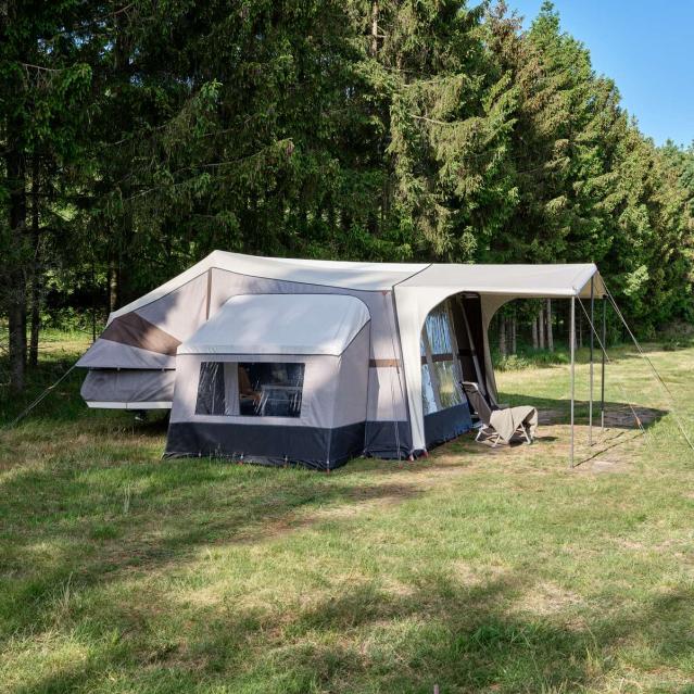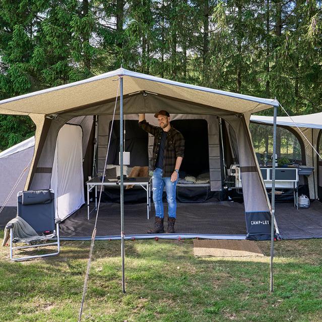Un Camp-let est plus confortable qu'une tente traditionnelle et plus flexible qu'une caravane. Il dispose de cabines de couchage spacieuses, d'un espace de vie avec de hauts plafonds et d'options supplémentaires telles qu'une annexe et une cuisine. Le mécanisme d'installation intelligent permet de monter facilement la tente, l'auvent et la cabine de couchage se dépliant en un seul mouvement. En seulement 15 à 20 minutes, vous êtes prêt à profiter du grand air.