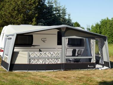 Les auvents sont souvent plus larges près de la caravane qu'à l'avant. C'est pourquoi il est conseillé de calculer la superficie au sol avant d'acheter un tapis de sol ou un autre revêtement.