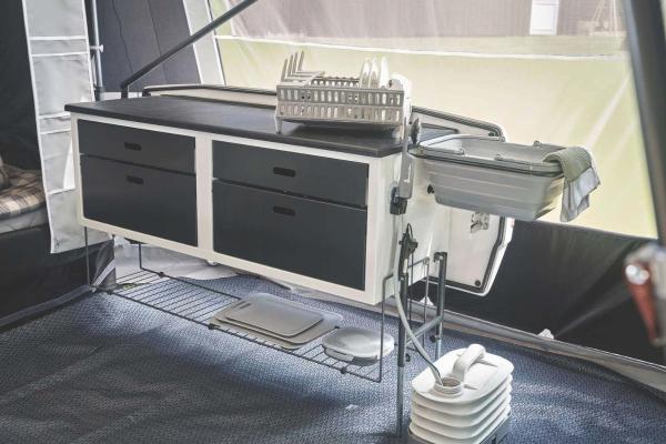 Sous le plan de travail, vous trouverez deux compartiments de rangement spacieux, deux tiroirs coulissants fonctionnels et une étagère, parfaits pour garder votre vaisselle et vos ustensiles de cuisine organisés et facilement accessibles. La cuisine comprend également un réservoir d'eau pliable de 10 litres et une cuvette de vaisselle pliable, qui prennent tous deux un minimum de place pendant le transport et le stockage. Pompe à eau électrique avec robinet et pomme de douche, qui se recharge par USB, pour être sûr d'avoir de l'eau pour la vaisselle et la douche.