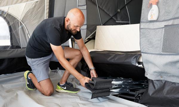 Le rangement de bagages s'installe sous les cabines de couchage de votre Camp-let. Sur le côté gauche, le rangement de bagages est doté d'un fond et convient parfaitement pour les bagages que vous voulez garder au sec.