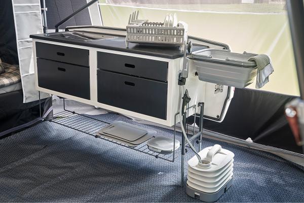 Unter der Arbeitsplatte befinden sich zwei Schubladen für Besteck und andere Kleinigkeiten, zwei geräumige Ablagefächer und ein Regal, in dem Sie Ihr Geschirr und Ihre Kochutensilien gut organisiert und leicht zugänglich aufbewahren können. Die Küche verfügt außerdem über einen faltbaren 10-Liter-Wasserkanister und eine faltbare Spülschüssel, die beide beim Transport nur wenig Platz benötigen. Der serienmäßige Wasserhahn ist mit einem Akku ausgestattet der 40 min. im Dauerbetrieb gewährleistet. Die integrierte Tauchpumpe fördert dabei 3,5 L pro Minute.